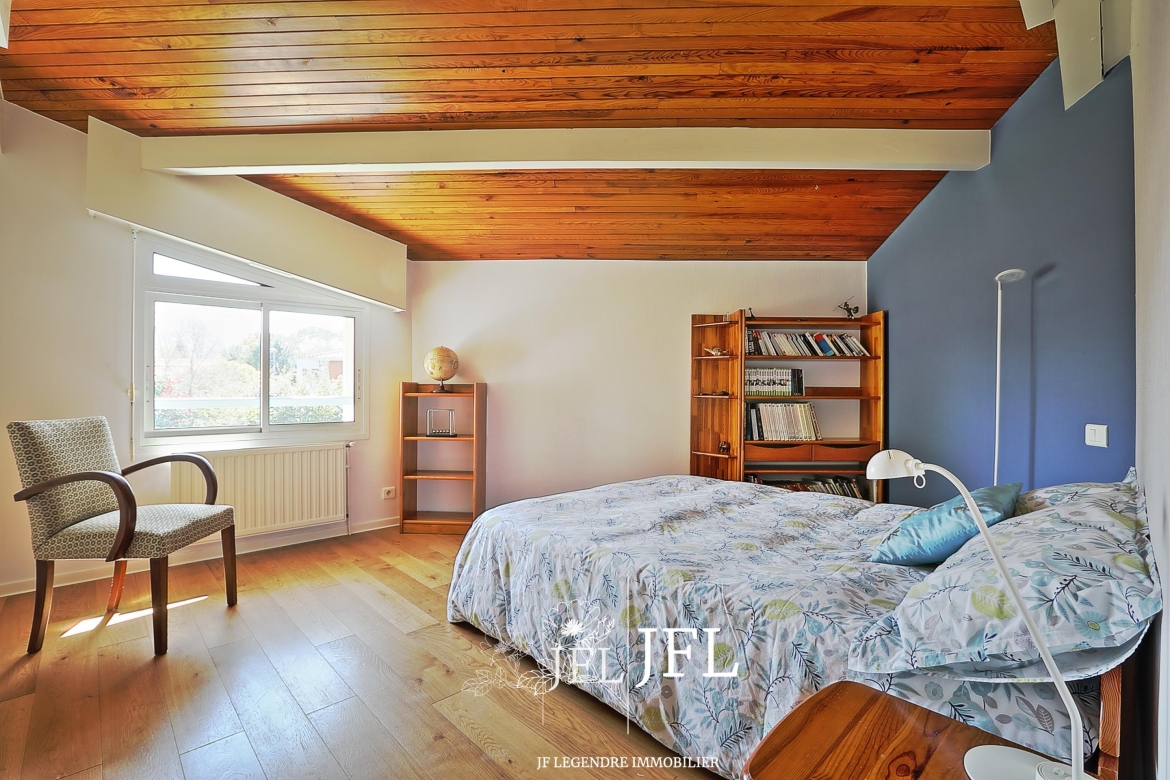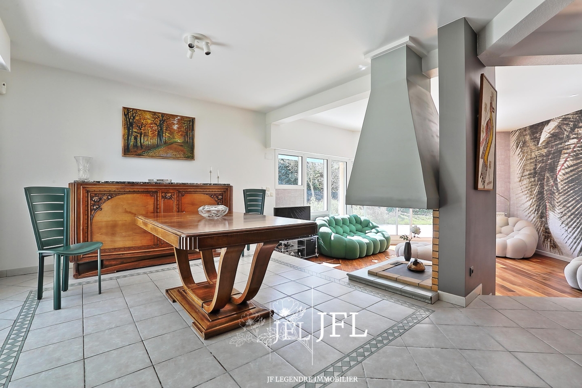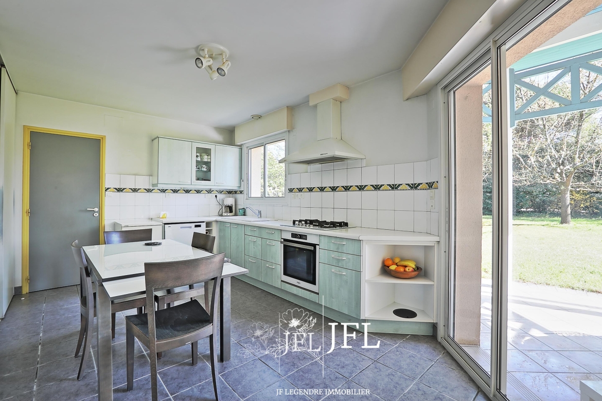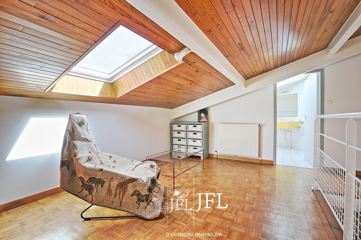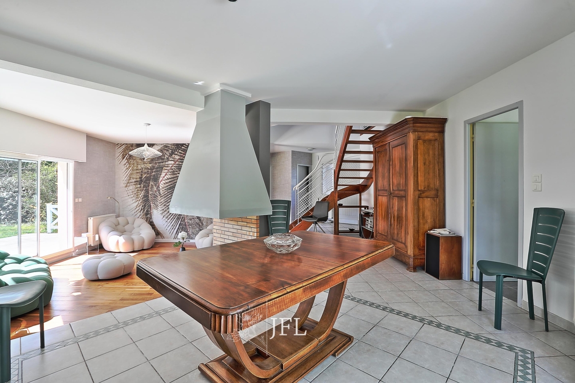 Implantée sur un grand terrain clos et arboré d’environ 2 000 m² (fruitiers et essences diverses), la propriété bénéficie d’une possibilité de division parcellaire avec constructibilité selon les modalités du PLUI en vigueur. La villa, parfaitement entretenue, offre 170 m² habitables sur deux niveaux : au rez-de-chaussée, un espace de vie lumineux exposé sud-est avec salon et cheminée, une grande cuisine prolongée par une terrasse couverte, une chambre avec salle de bains, un bureau, dressing et WC séparé ; à l’étage, une mezzanine desservant trois chambres avec placards, une salle d’eau, WC séparé et combles. Un cellier et un grand garage de 30 m² complètent le bien.