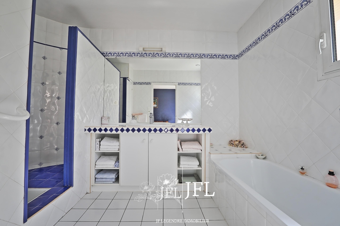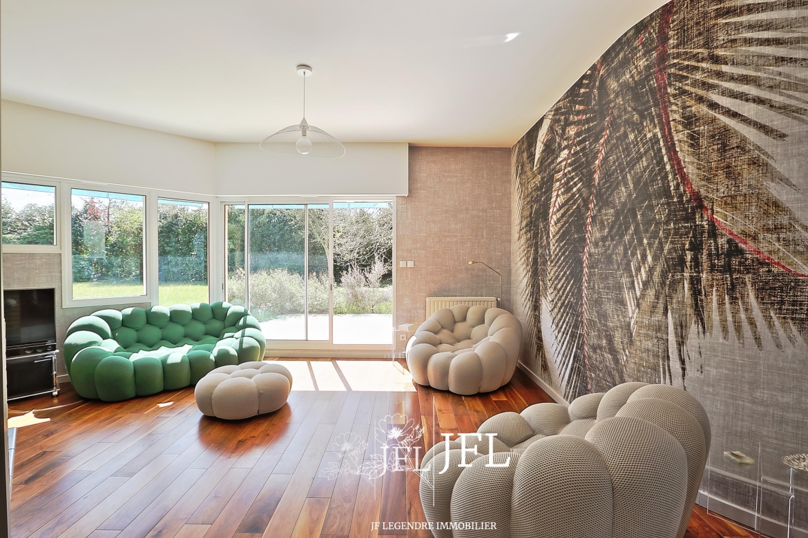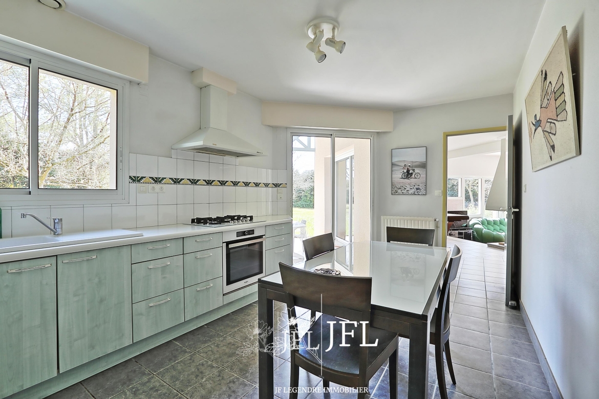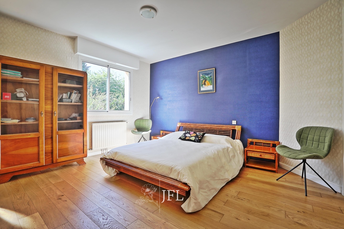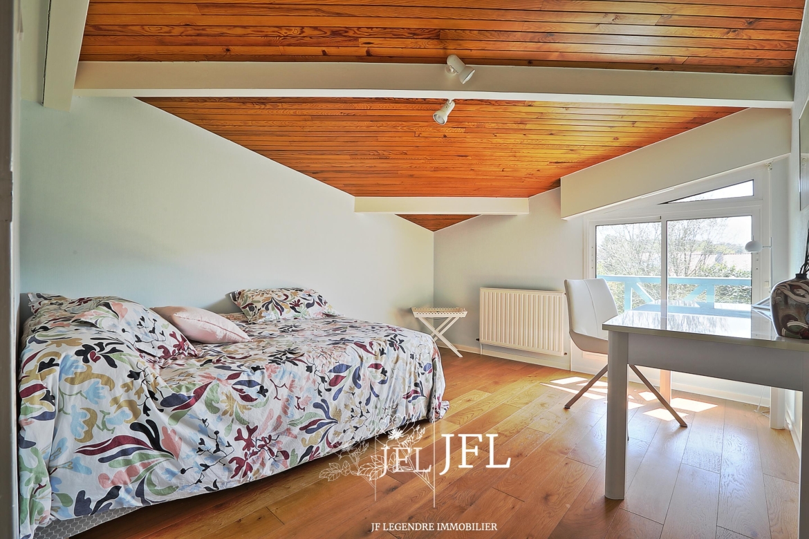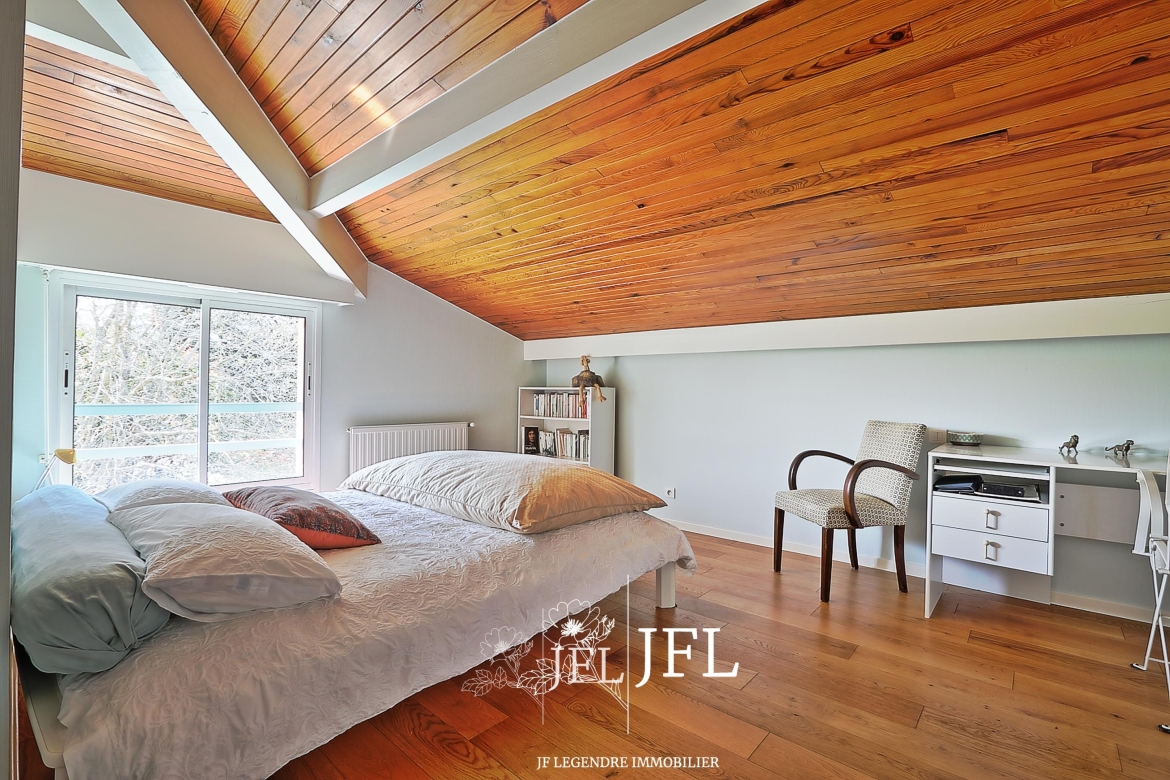 Implantée sur un grand terrain clos et arboré d’environ 2 000 m² (fruitiers et essences diverses), la propriété bénéficie d’une possibilité de division parcellaire avec constructibilité selon les modalités du PLUI en vigueur. La villa, parfaitement entretenue, offre 170 m² habitables sur deux niveaux : au rez-de-chaussée, un espace de vie lumineux exposé sud-est avec salon et cheminée, une grande cuisine prolongée par une terrasse couverte, une chambre avec salle de bains, un bureau, dressing et WC séparé ; à l’étage, une mezzanine desservant trois chambres avec placards, une salle d’eau, WC séparé et combles. Un cellier et un grand garage de 30 m² complètent le bien.