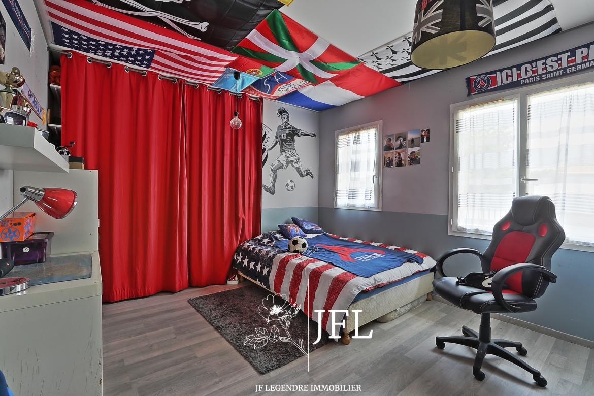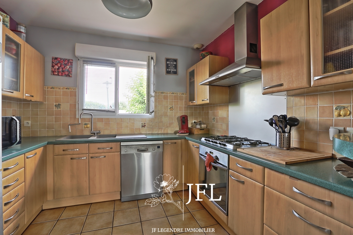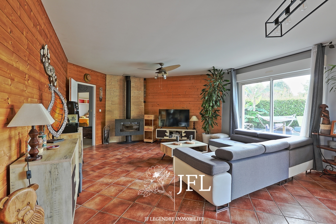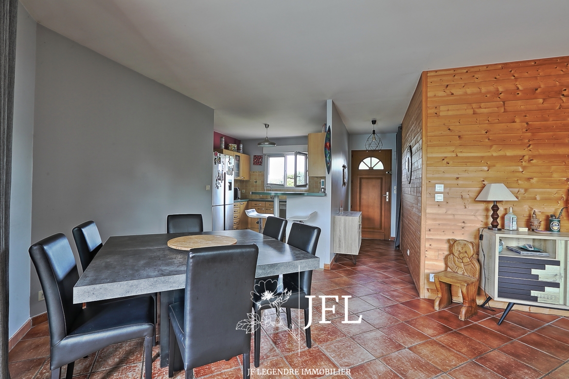 Idéalement située en fond d'impasse, cette maison, de plain-pied propose une surface habitable de 95 m² environ comprenant une entrée avec placard, une pièce de vie très lumineuse avec insert, une cuisine ouverte toute équipée, trois chambres, une salle de bains avec cabine de douche, un WC séparé et un garage aménagé en buanderie-cellier.